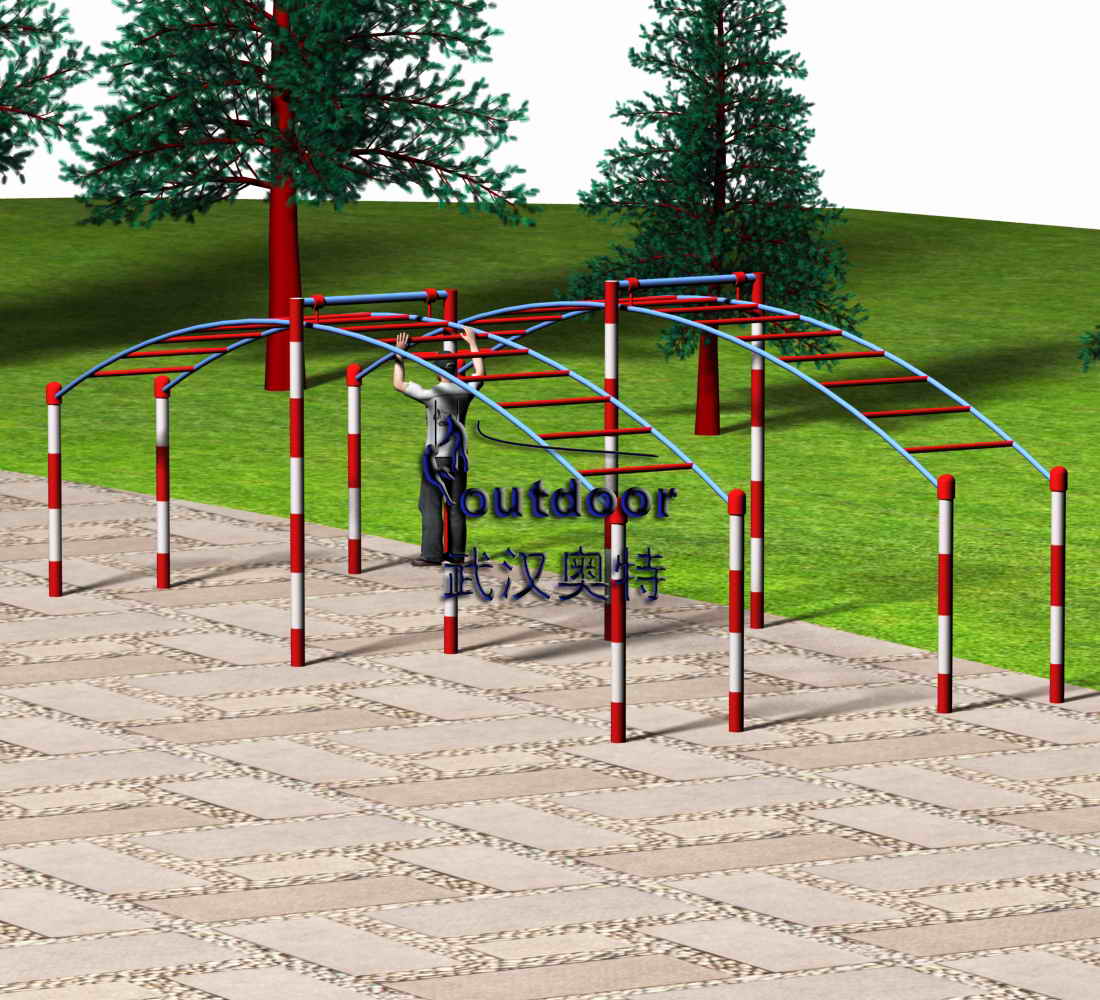 隊(duì)員利用助跑沿引橋沖上助木,迅速通過并跳到地面。 |
