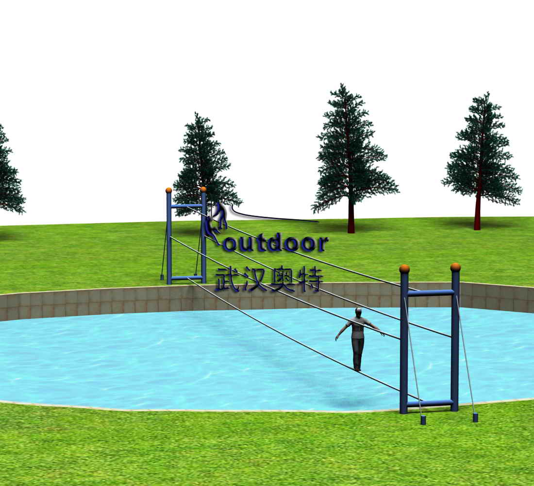 拓展器械產(chǎn)品介紹:參與者腳踩鋼纜,雙手扶著保護(hù)繩,穿越水上簡易的橋面